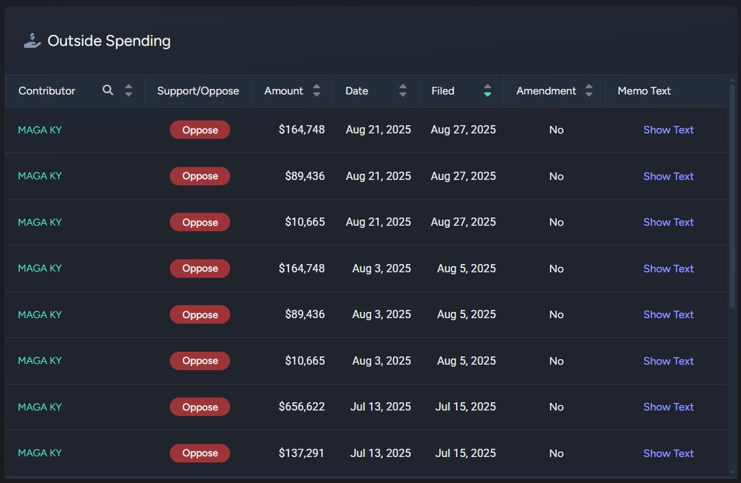 The Opponents tab flips the perspective, showing campaign spending and financial activity aimed at a candidate’s defeat. Follow the flow of outside money opposing a campaign, and compare it against the fundraising strength of rival candidates within the same district.