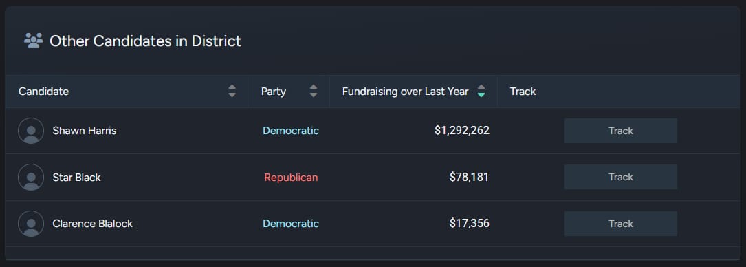 The “Other Candidates in District” table lets you toggle seamlessly between each politician’s page, making it easy to see who’s gaining traction in competitive races.