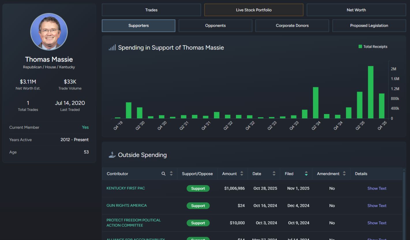 Representative Thomas Massie, for instance, stands out as a timely example with a surge in recent fundraising activity visible across both views.