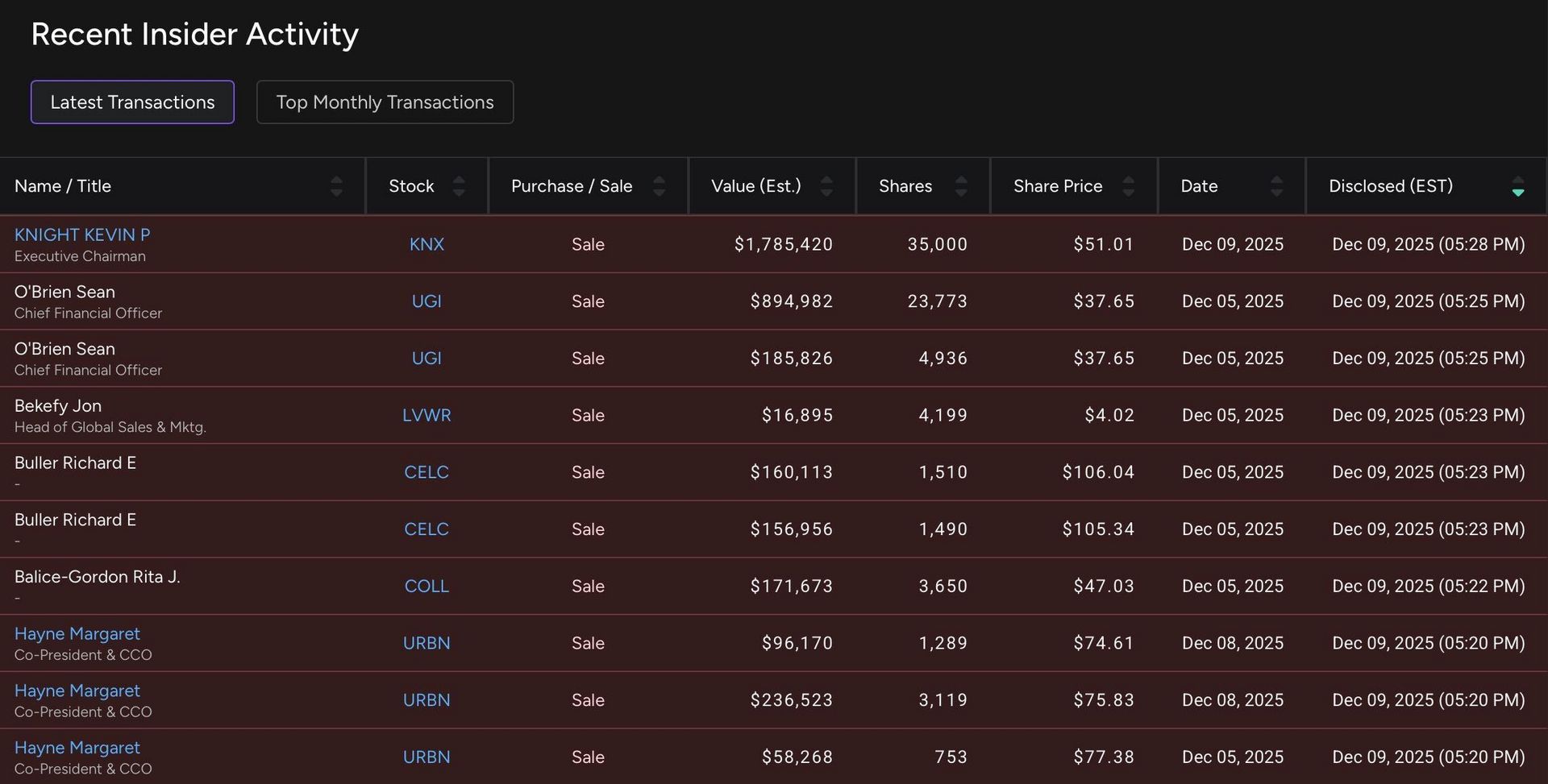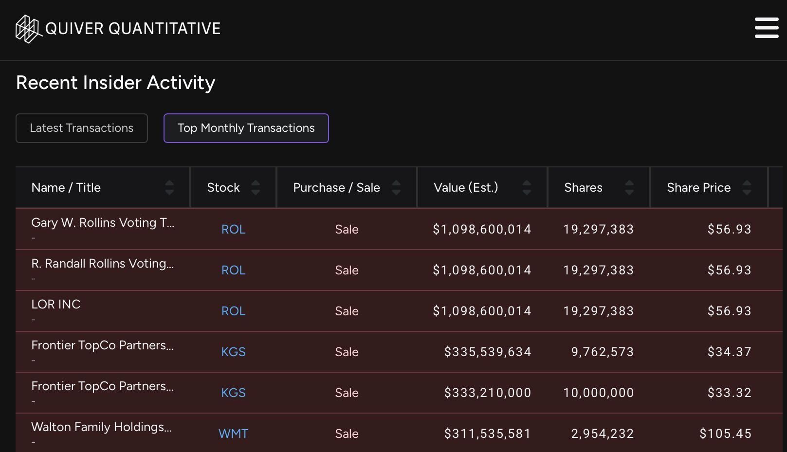 Alongside the latest trades, there is now a “Top Monthly Transactions” view highlighting the largest insider purchases and sales over the past month, including role, ticker, size of the trade, and execution price.