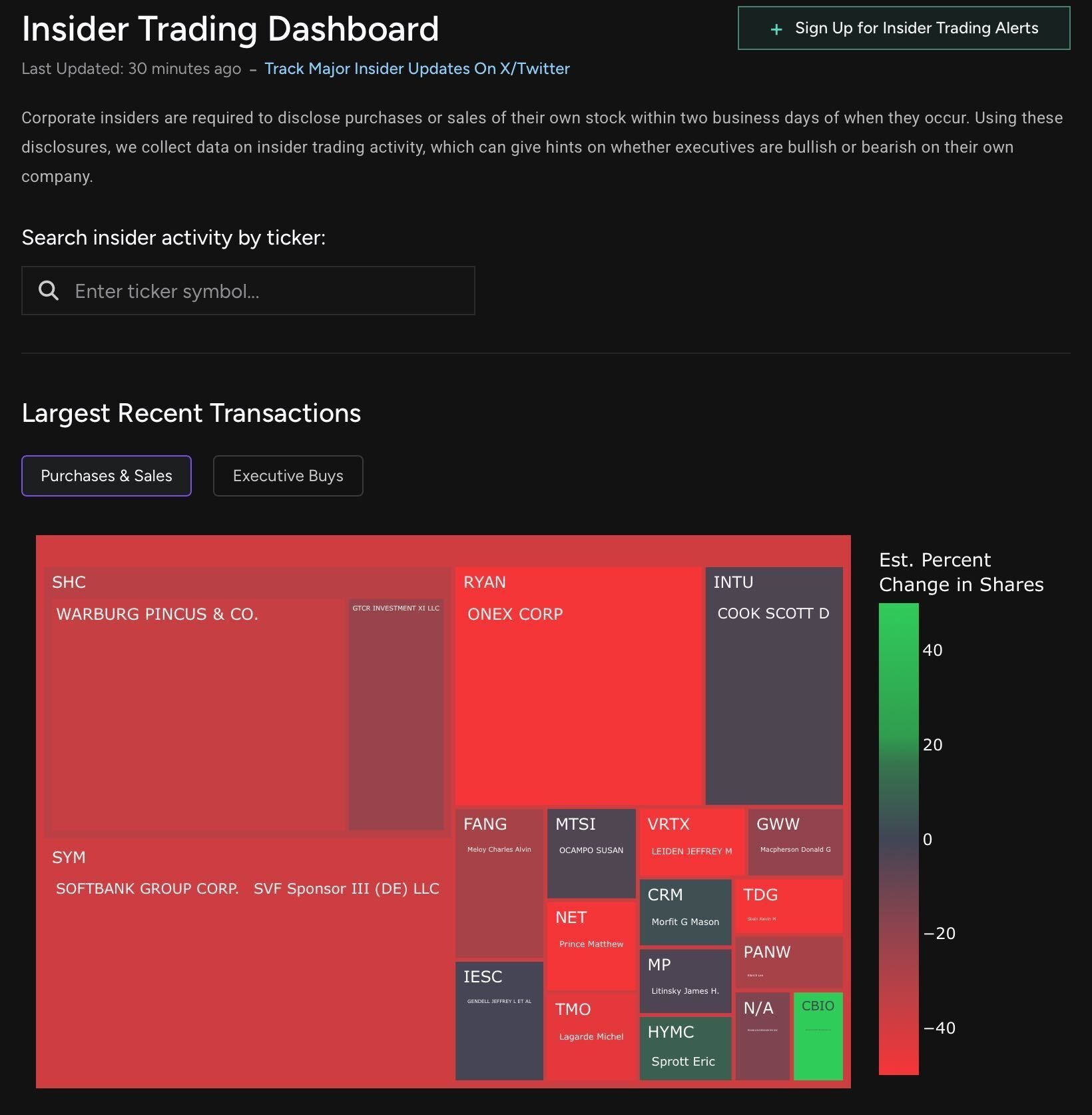 Quiver’s Insider Trading Dashboard lets you see what corporate executives are doing with their own stock in near real time, using public Form 4 disclosures filed within two business days of each trade.